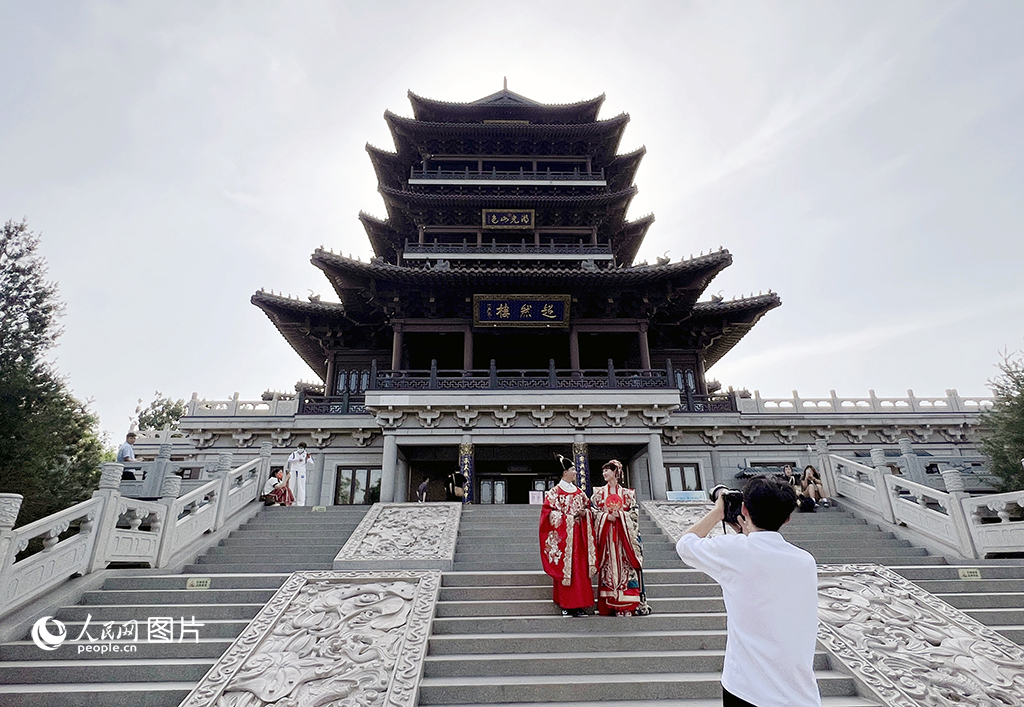 今年以来,济南大明湖畔的“江北第一楼”超然楼因其独特的人文气息和景观气质火爆网络,成为爆火“出圈”的网红打卡地。5月16日,在大明湖超然楼前,身穿古代服饰打卡拍照的游客络绎不绝,在山色与湖光之间尽展古韵美感。人民网记者 刘祺摄