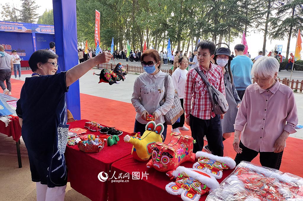 5月14日,“中国旅游日”主题周活动期间,河南省三门峡市陕州区在黄河岸边举办“传承多彩非遗”魅力陕州非物质文化遗产展演体验活动,大展传统艺术魅力,为群众献上了一场“非遗文化盛宴”。在活动现场,当地省级非遗传承人向游客展示文创产品布老虎。人民网记者 王玉兴摄