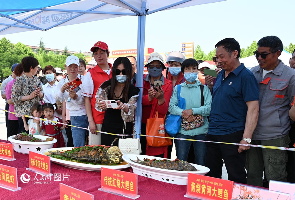 5月17日,“中国旅游日”主题周活动期间,河南省义马市举办“樱红五月”美食节,集中展示当地的特色美食、名优特产,为了让游客有更好的体验,当地12家饭店还进行了精彩纷呈的厨艺大比拼。活动现场,游客在围观经典豫菜“红烧黄河大鲤鱼”。人民网记者 王玉兴摄