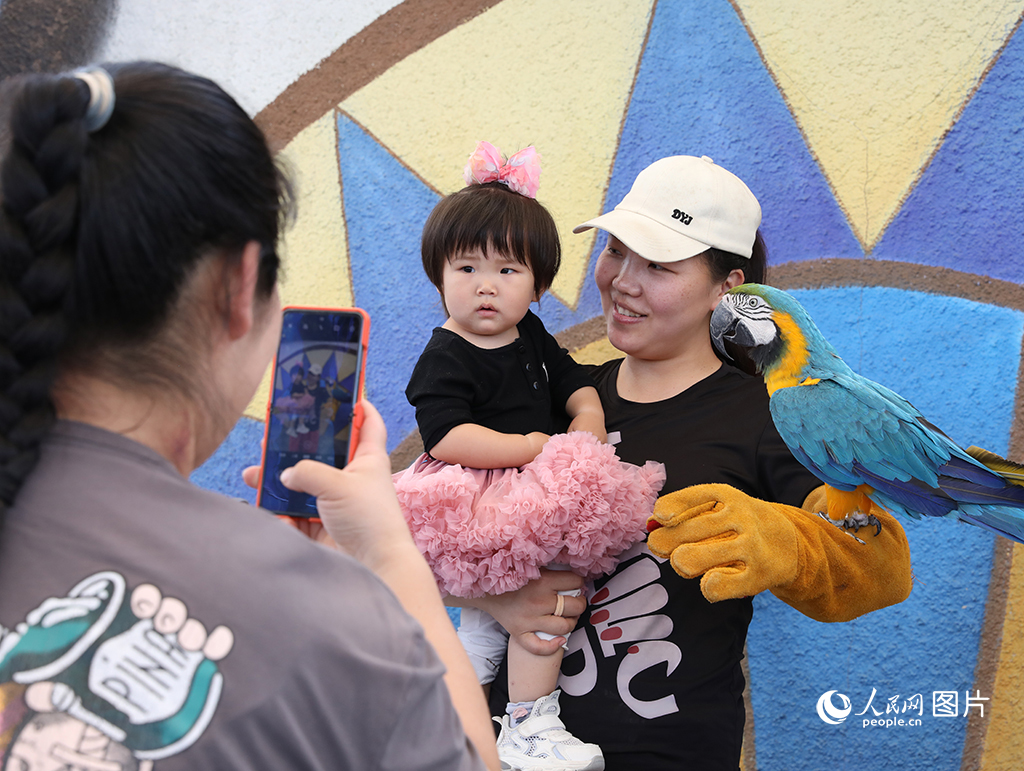 5月18日,雄安郊野公园辛玛森林动物乐园内,家长带着孩子正与表演动物互动。人民网 李兆民摄
