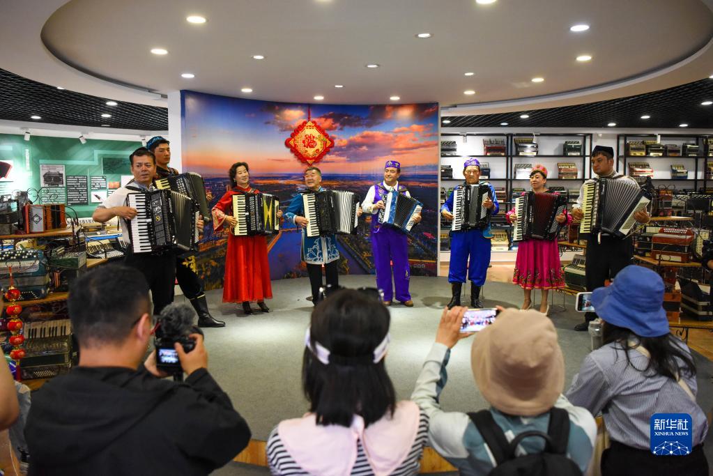 在伊宁市六星街,游客在亚历山大手风琴珍藏馆欣赏多民族手风琴乐队的表演(5月19日摄)。
