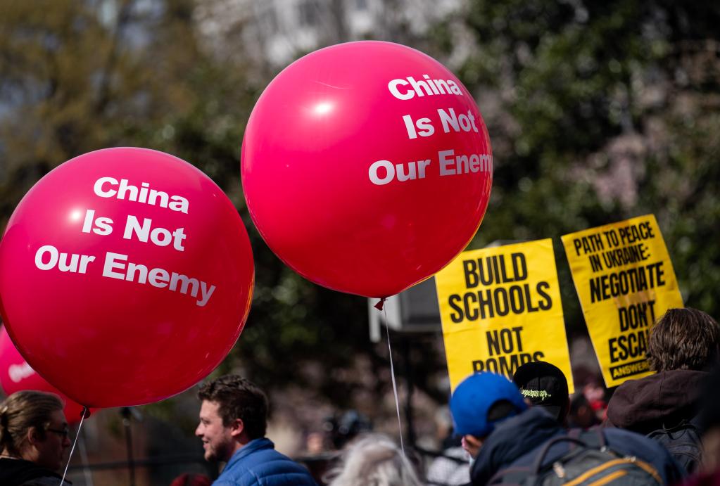 3月18日,反战人士在美国首都华盛顿市白宫北侧拉斐特广场举行集会,敦促美国政府反思伊拉克战争,呼吁美国关停“战争机器”。有人举着印有“中国不是我们的敌人”“要建学校,别造炸弹”等字样的气球或标语牌。新华社记者 刘杰 摄