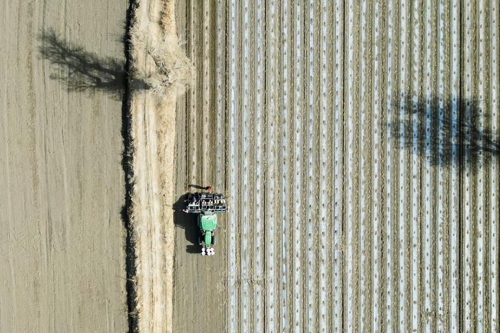 在新疆尉犁县,棉农进行春播作业(3月29日摄,无人机照片)。新华社记者 郝昭 摄