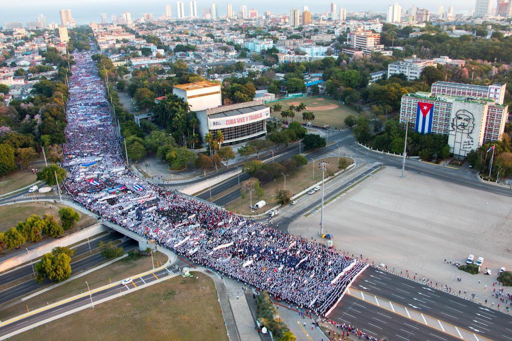 2022年5月1日,古巴民众在哈瓦那参加“五一”国际劳动节集会游行,反对美国对古封锁,表达爱国情感。新华社发(华金·埃尔南德斯摄)