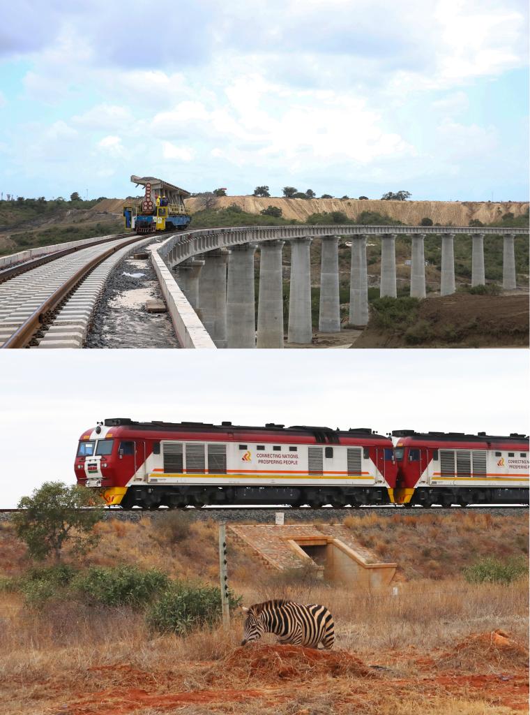 下图:2022年7月28日,在肯尼亚察沃,一匹斑马在蒙内铁路行驶的列车附近吃草。新华社记者 董江辉 摄