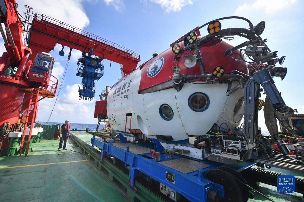 “深海勇士”号载人潜水器即将下潜开始当日的水下调查(5月27日摄)。新华社记者 蒲晓旭 摄