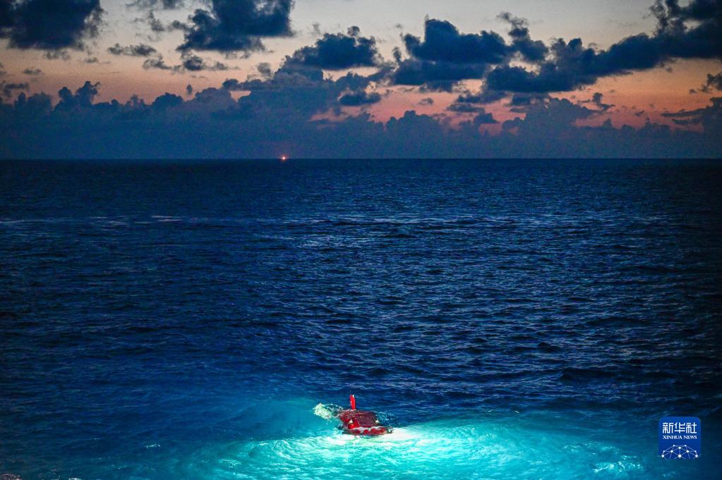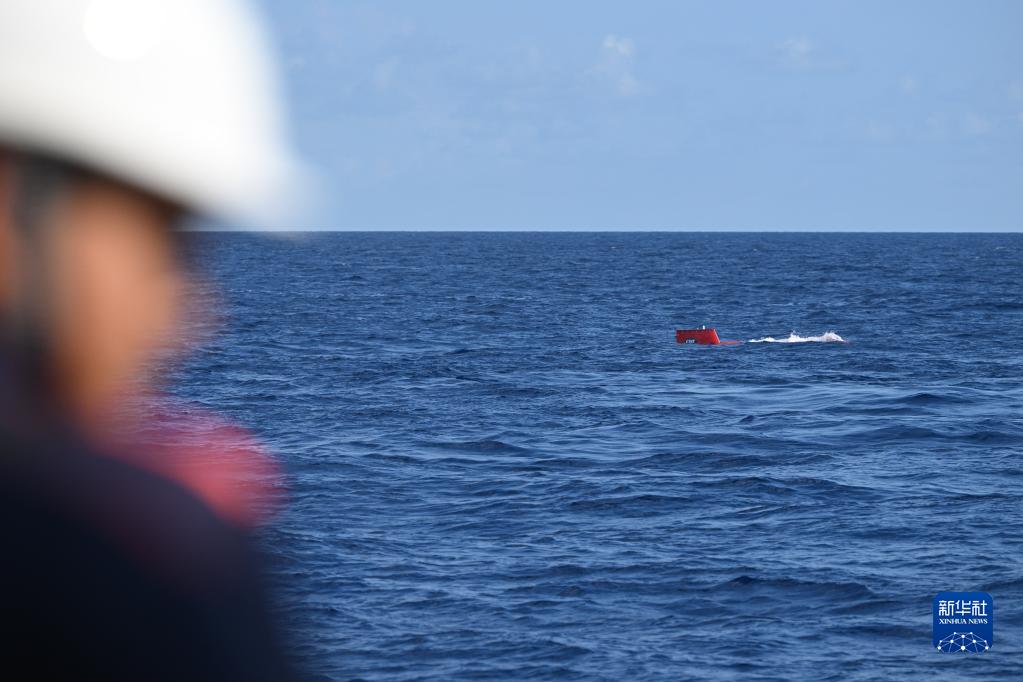 在结束当日的水下调查后,搭载着考古队员的“深海勇士”号载人潜水器浮出海面(5月27日摄)。新华社记者 蒲晓旭 摄