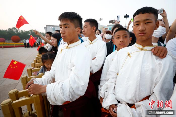 6月1日清晨的天安门广场,一群来自青海玉树、身着传统藏族服饰的孩子组成了一道亮丽的风景线。