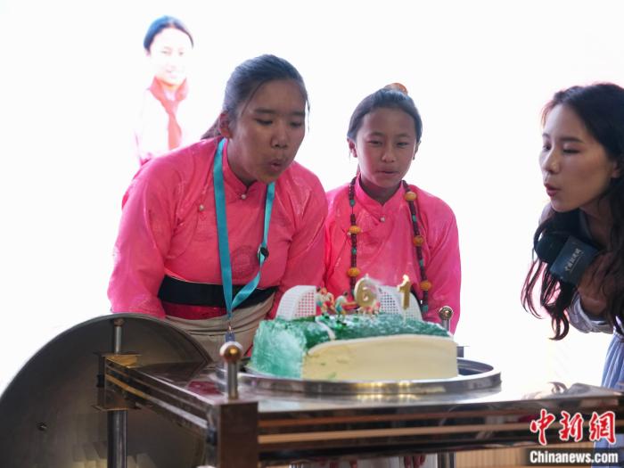 闹增拉毛和卓尕才仁吹蛋糕。中新社崔楠 摄