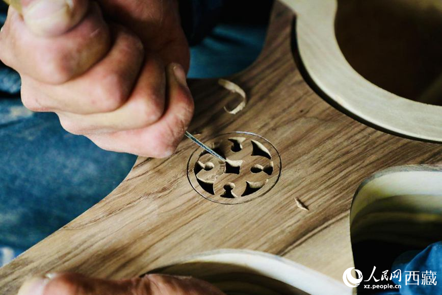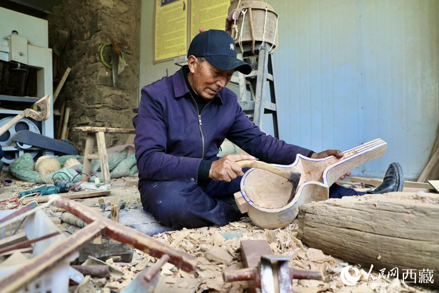 娘嘎扎念琴制作技艺传承人罗布次旦在制作扎念琴。人民网记者 次仁罗布摄