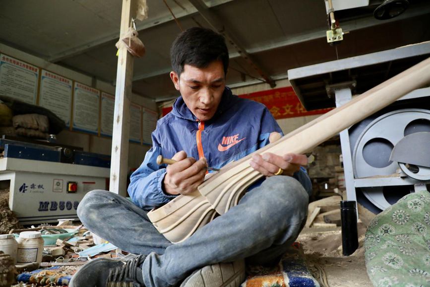 娘嘎扎念琴制作技艺传承人罗布次旦的儿子在制作扎念琴。人民网记者 次仁罗布摄