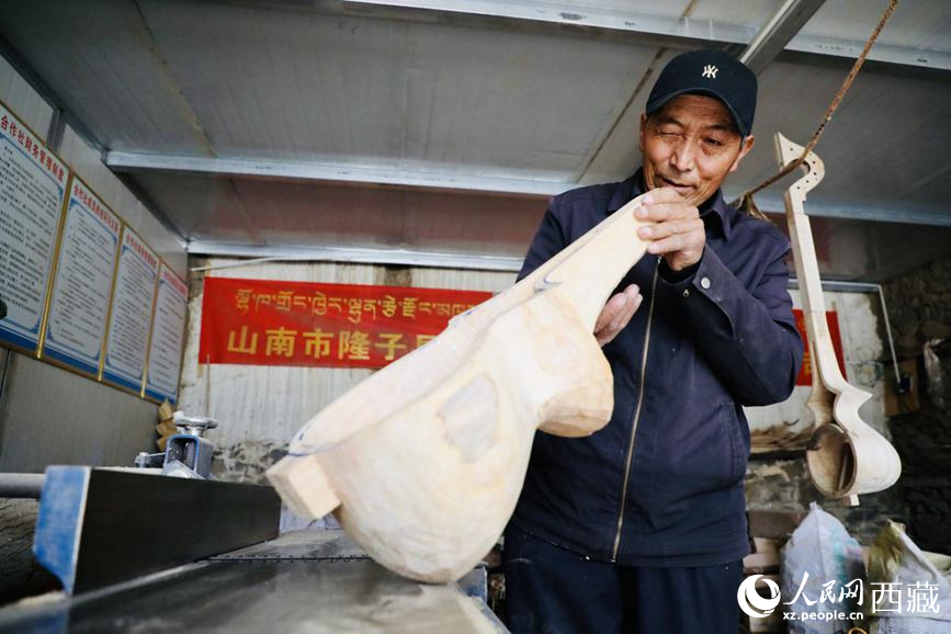 传承人罗布次旦检查琴体打磨后的样板。人民网记者 次仁罗布摄