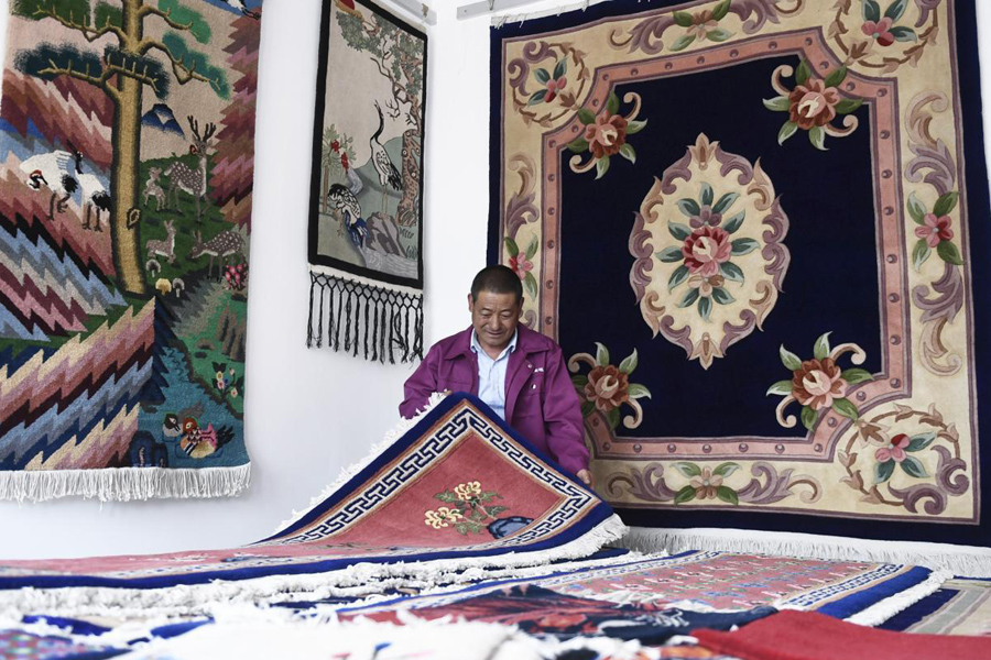 在西宁市湟中县上新庄镇加牙村,杨永良在整理制作好的藏毯。 新华社记者 张龙 摄