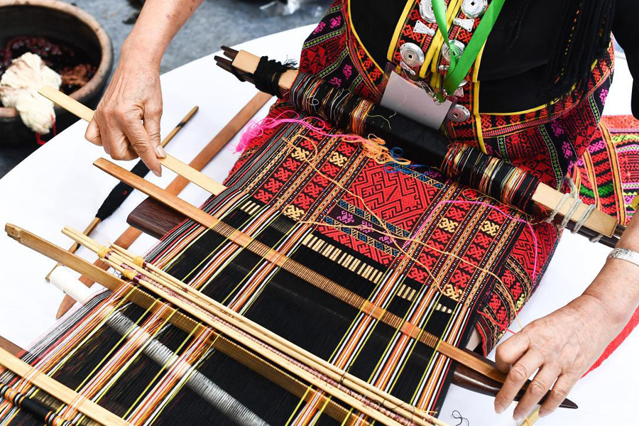 在非物质文化遗产传统织绣印染技艺项目精品展上,手工艺人正在编织黎锦。新华社记者 杨冠宇 摄
