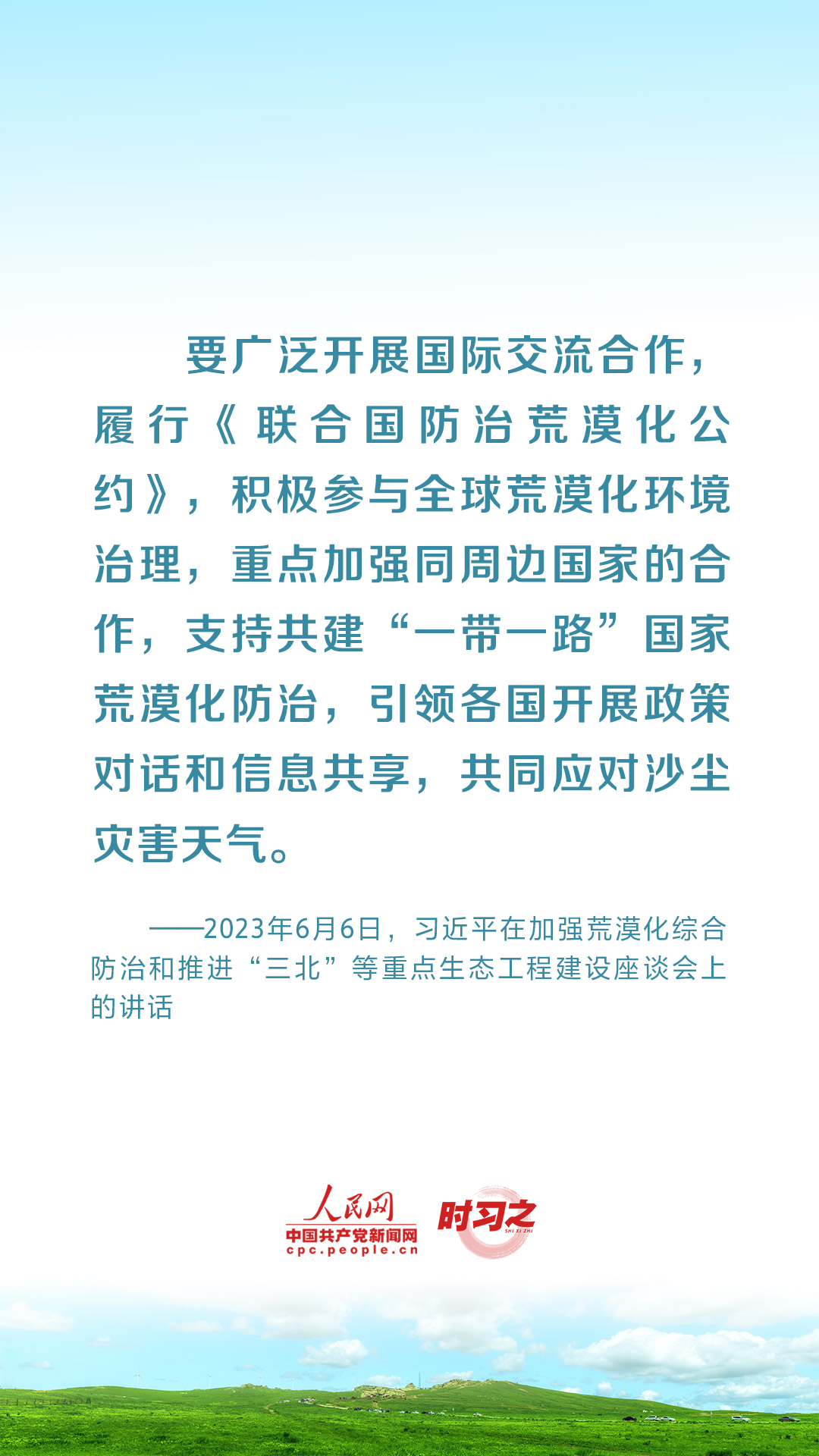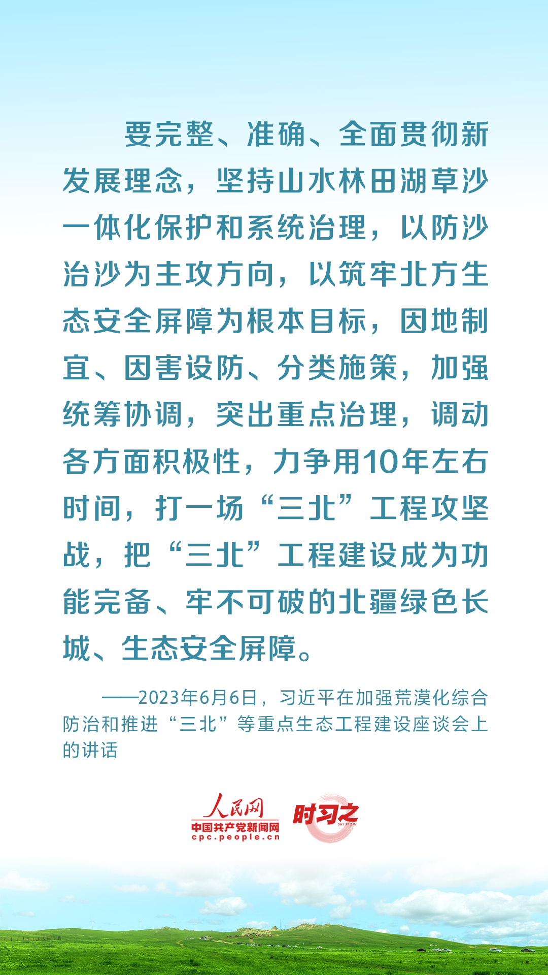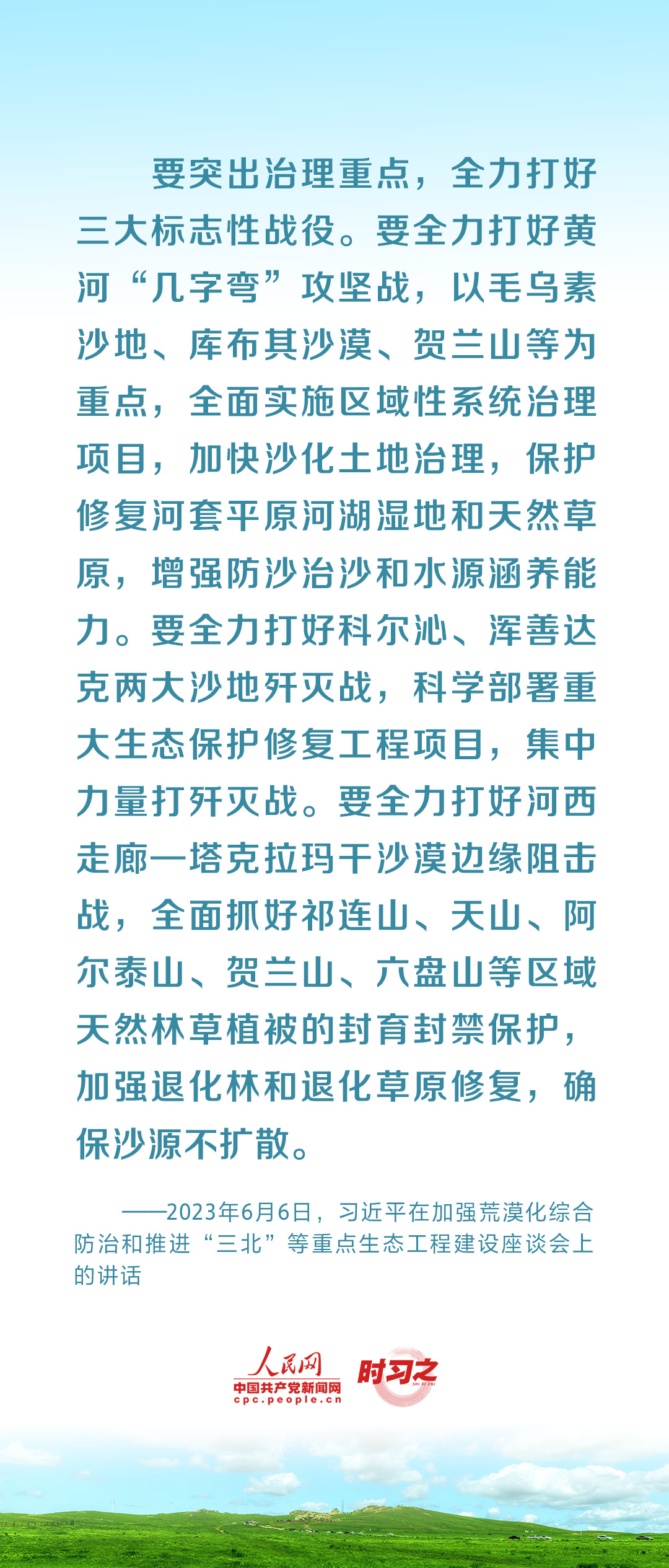 2023年6月5日至6日,中共中央总书记、国家主席、中央军委主席习近平在内蒙古自治区巴彦淖尔市考察,主持召开加强荒漠化综合防治和推进“三北”等重点生态工程建设座谈会并发表重要讲话。座谈会上,习近平对走好中国特色防沙治沙道路提出工作要求。