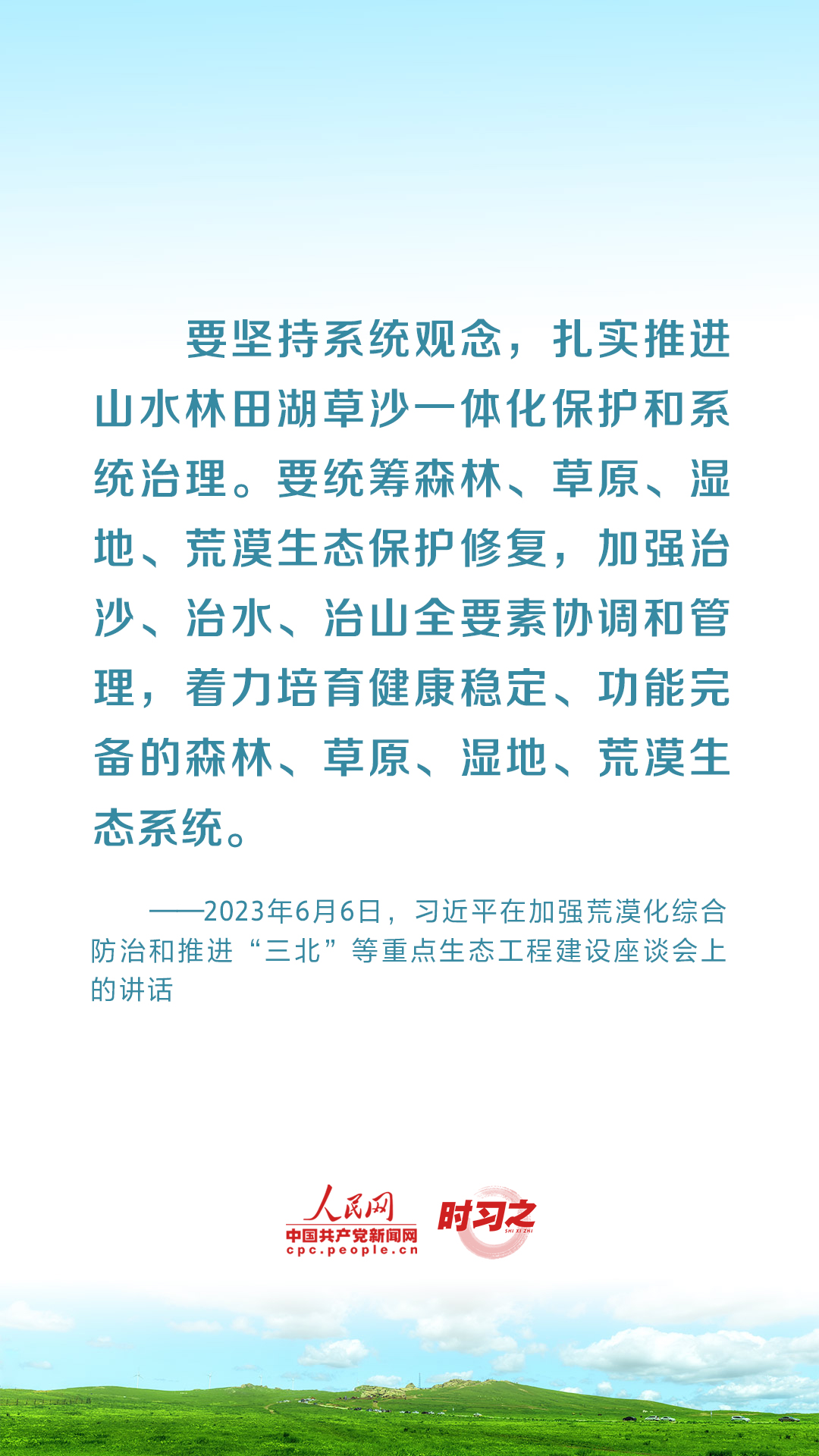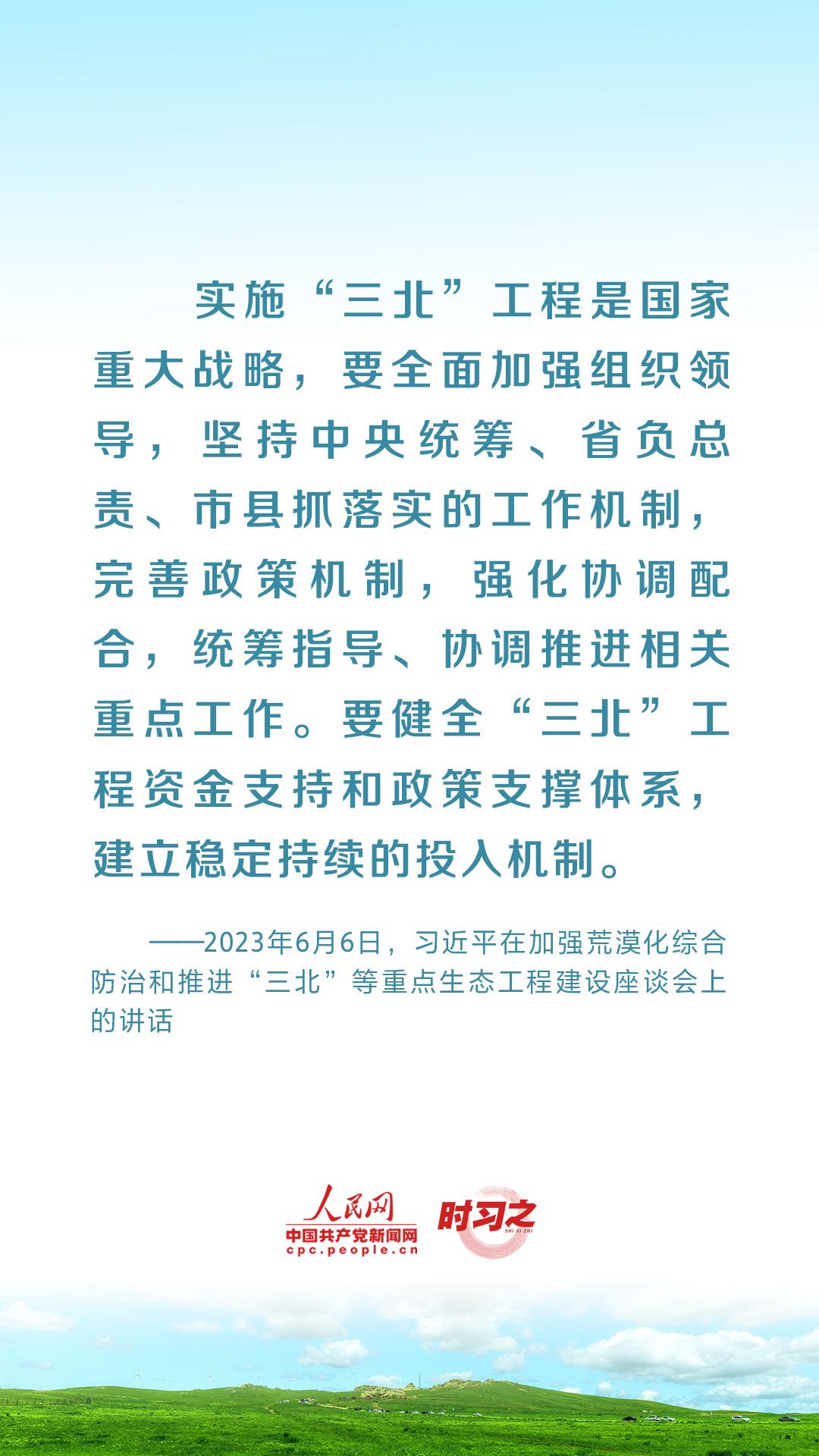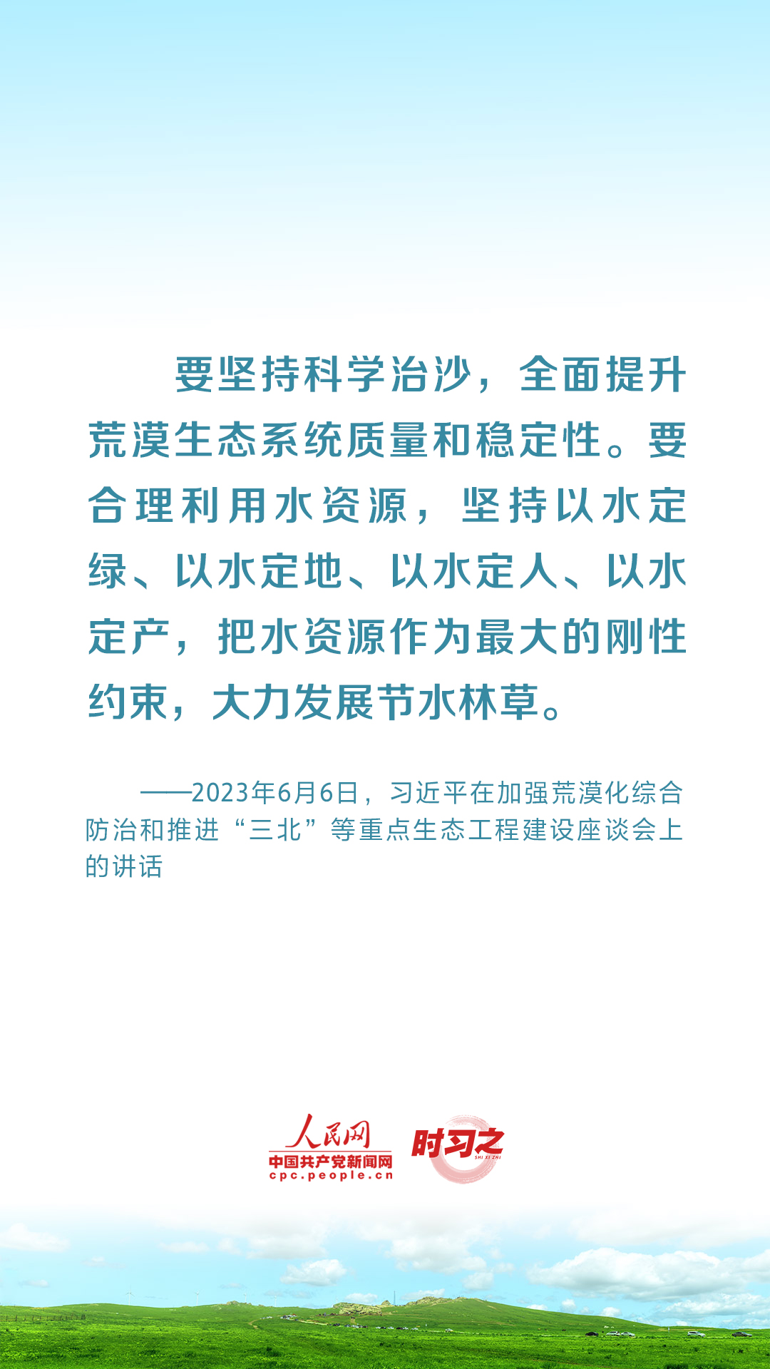 2023年6月5日至6日,中共中央总书记、国家主席、中央军委主席习近平在内蒙古自治区巴彦淖尔市考察,主持召开加强荒漠化综合防治和推进“三北”等重点生态工程建设座谈会并发表重要讲话。座谈会上,习近平对走好中国特色防沙治沙道路提出工作要求。
