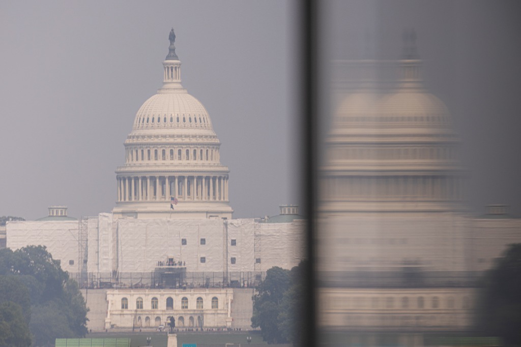 这是6月7日在美国首都华盛顿拍摄的烟尘笼罩的国会大厦。新华社发(亚伦摄)
