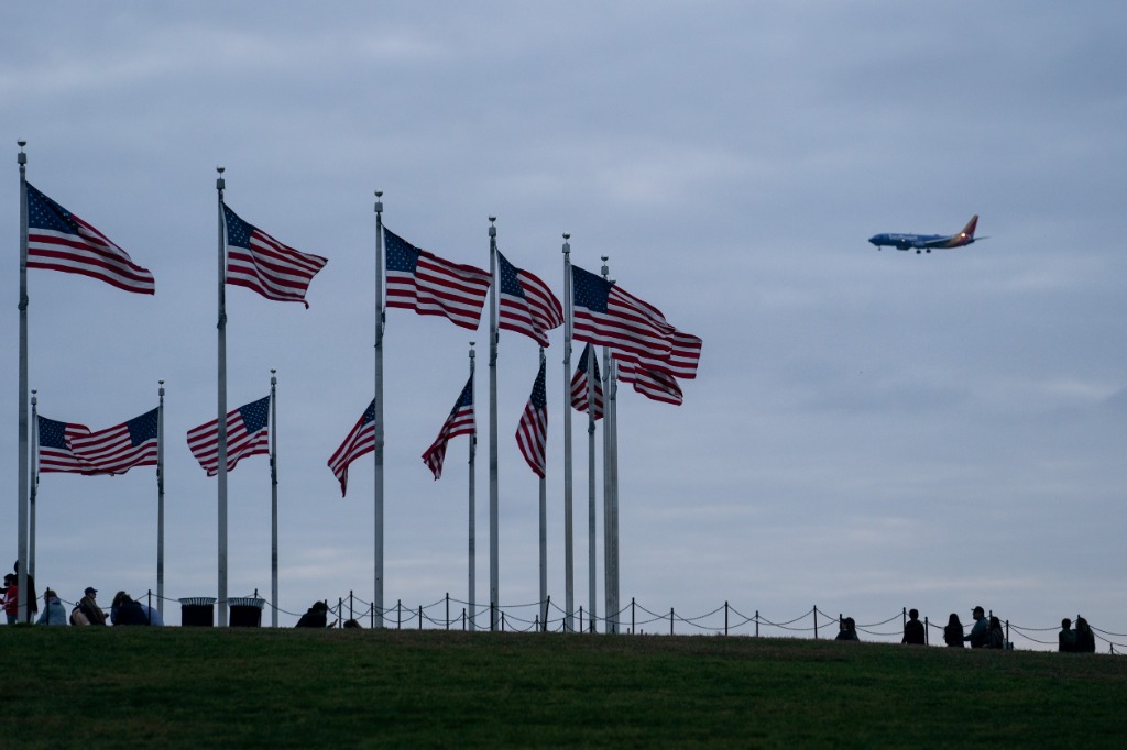 2022年11月10日,在美国首都华盛顿,一架飞机从美国国旗上空飞过。新华社记者刘杰摄