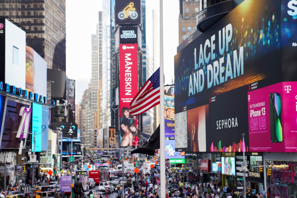 这是2022年5月17日在美国纽约时报广场拍摄的美国国旗。新华社记者王迎摄