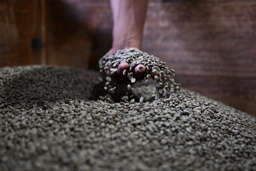 5月6日,在洪都拉斯马尔卡拉的一家咖啡工厂,工人查看准备出口的咖啡生豆。新华社记者 辛悦卫 摄