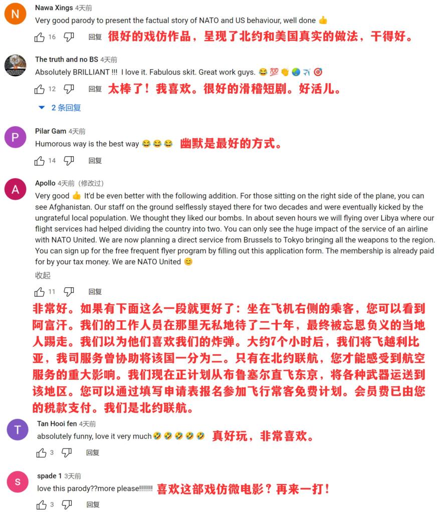 网友们纷纷留言,称赞电影处处细节戳中真相。甚至还有“粉丝”为微电影续写剧本,生动列举以美国为首的北约在阿富汗、利比亚等地破坏和平稳定的“黑历史”。