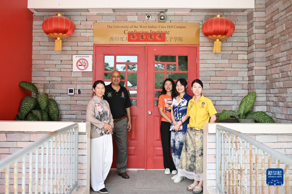 6月2日,中巴两国的老师在巴巴多斯西印度大学凯夫希尔分校孔子学院前合影。新华社记者 辛悦卫 摄