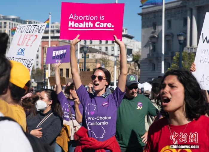 资料图:当地时间2022年6月24日,美国旧金山民众聚集在市政厅前,抗议美联邦最高法院推翻“罗诉韦德案”。中新社记者 刘关关 摄