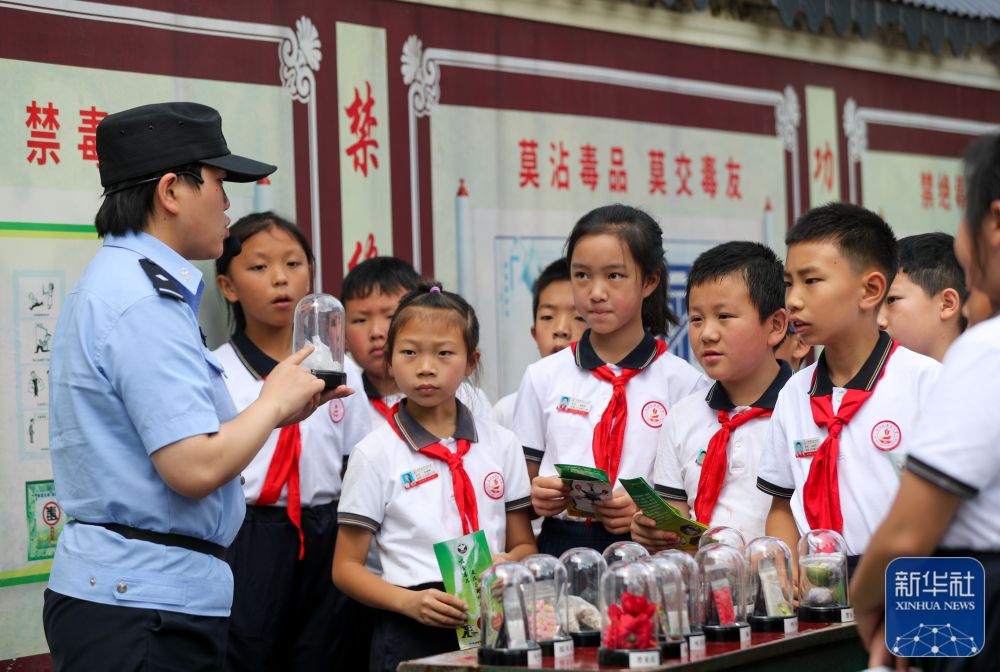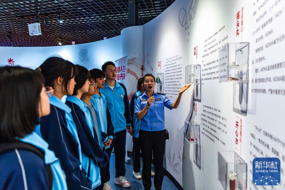 6月25日,民警在贵州省安顺市禁毒宣传教育基地为学生讲解毒品相关知识。新华社发(陈熙摄)