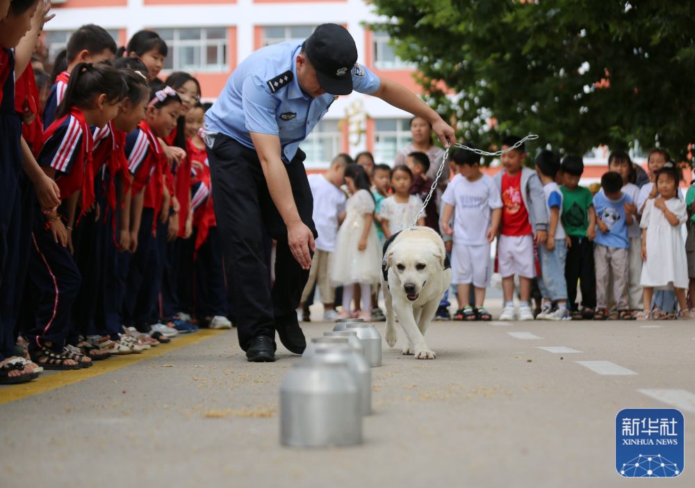 6月25日,山东省沂南县公安局在辛集镇中心小学开展禁毒主题宣传活动,给小朋友演示缉毒犬嗅毒。新华社发(王彦冰摄)