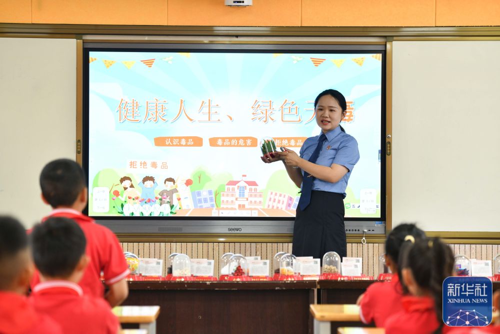 6月25日,贵州省黔东南苗族侗族自治州黄平县检察干警在新州镇第三小学为学生讲解禁毒知识。新华社发(梁文摄)