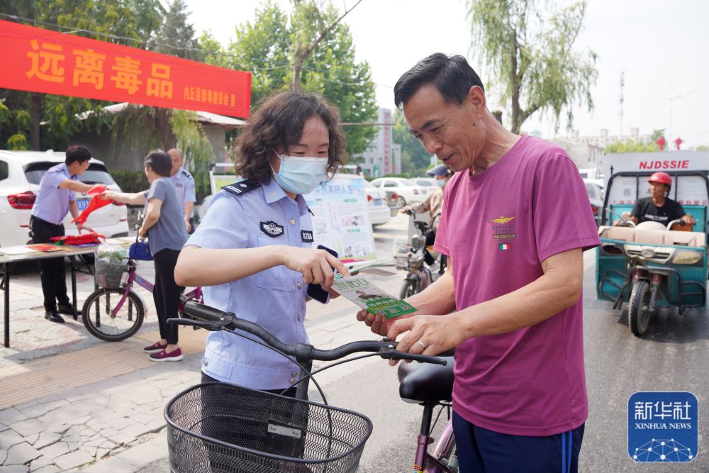 6月25日,河北省邢台市内丘县公安局禁毒中队民警向群众宣传禁毒知识。新华社发(刘继东摄)