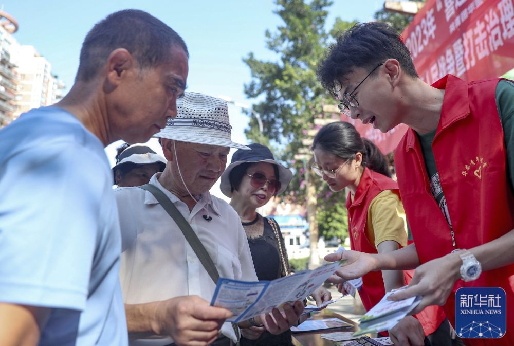 6月25日, 四川省华蓥市青年志愿者向市民宣传禁毒等知识。新华社发(邱海鹰摄)