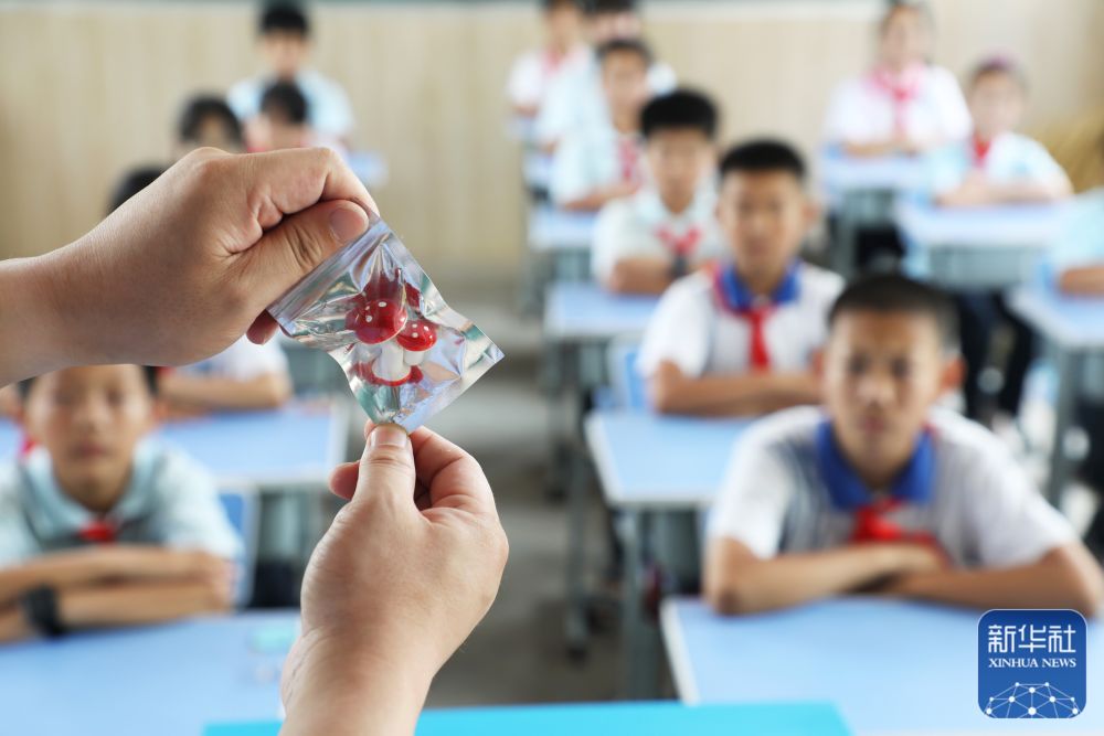 6月25日,在河北省唐山市丰润区姜家营镇杨家铺小学,民警为学生讲解毒品危害。新华社发(朱大勇摄)