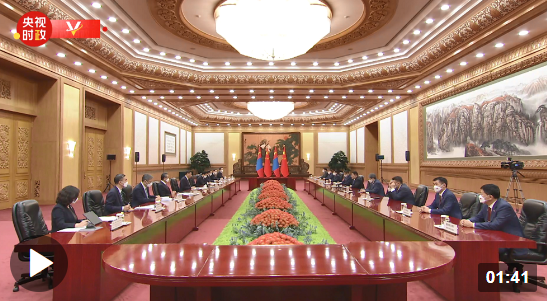 奥云额尔登说:“习近平主席,很高兴再次同您会面。疫情期间,在您的领导下,中国成功举办2022年北京冬奥会,这为全球抗击疫情注入了强烈的信心。蒙古谚语说:患难见真情。疫情期间,中国将自己的疫苗和物资援助给我们,蒙古国人民不会忘记。”