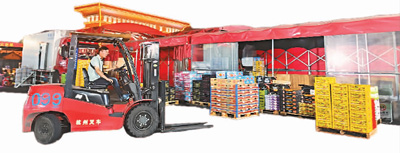 北京新发地农产品批发市场国际水果交易区内,商贩正在用叉车卸货。