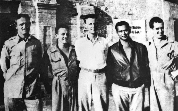 二战期间,被新四军营救的5名美国飞虎队飞行员在新四军驻地合影(1944年8月摄)。新华社发