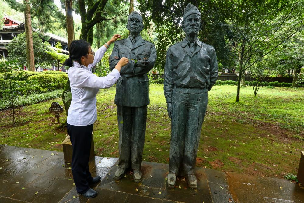 8月31日,在云南腾冲市国殇墓园内,工作人员为史迪威将军雕像(左为史迪威、右为陈纳德)清理落叶。