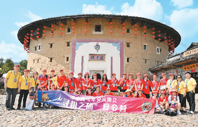 在福建省漳州市,参加“世遗泉州 悦见丰泽”2023年“中国寻根之旅”夏令营的营员在南靖土楼前合影。