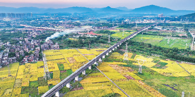 在广东清远,列车从金黄的稻田穿行而过。