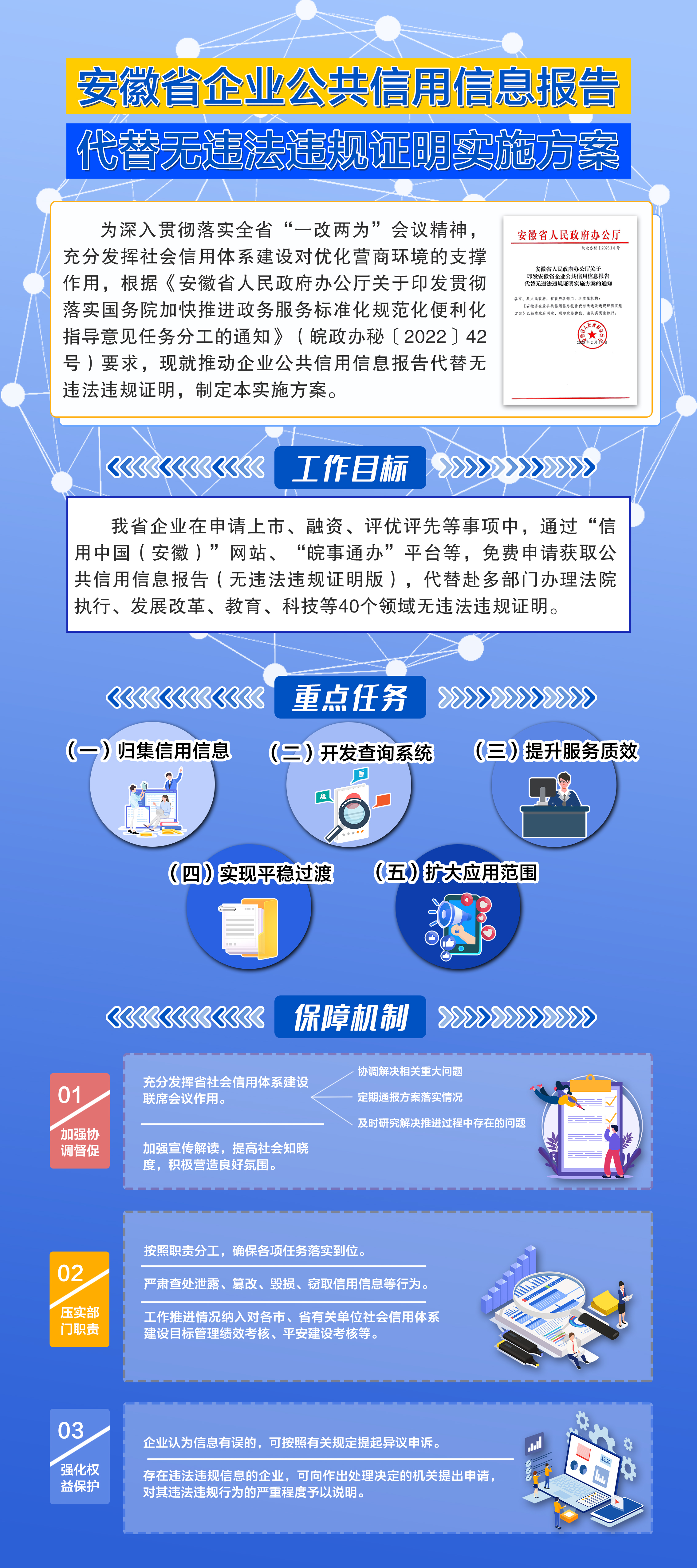 为了推动改革,安徽整合信息、重构流程,全面梳理无违法违规证明所需数据清单,打破部门信息壁垒,整合全省涉800多万经营主体各类信用信息59亿条。开发上线信用报告查询系统,构建线上、线下实时简便办理流程。