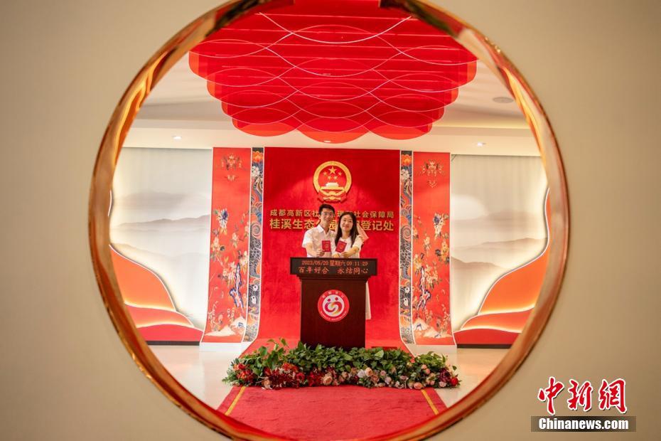 一对新人在婚姻登记处留下合影。刘忠俊 摄
