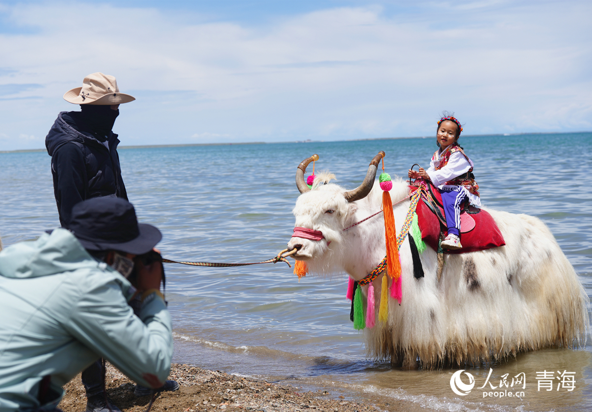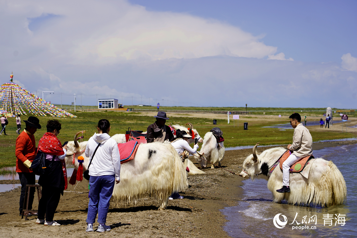 上班时间到,尕玛本牵着白牦牛来到了青海湖景区的西湖滩,与其他村民家的二三十头白牦牛排排站立在湖边,静待游客前来观赏、骑行、拍照。
