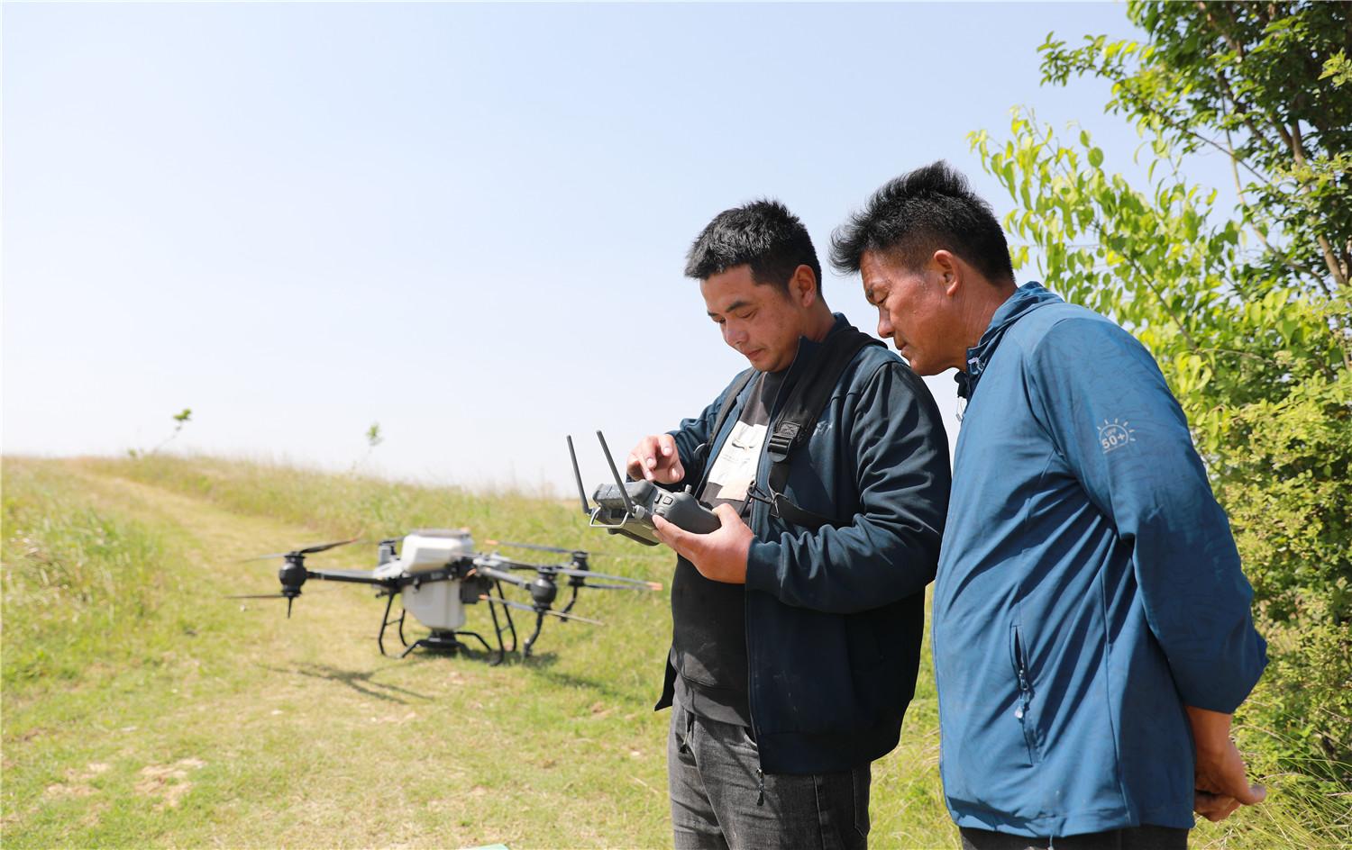 小岗村种粮大户程夕兵(右)和女婿周地帅操作无人机给水稻施肥。本报通讯员 陈华斌 摄