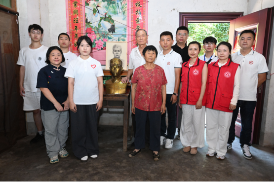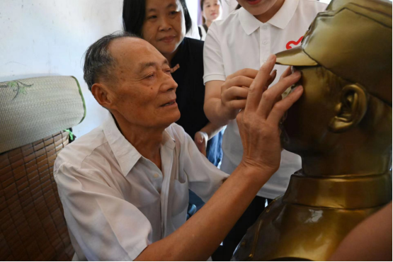 7月31日上午,烈士孟祥斌的遗孀、“为烈士画像”公益活动发起人叶庆华,在安徽师范大学美术学院“红色青春守护人”工作室志愿者的陪伴下,顶着烈日,将一个半米高的黄铜色半身塑像送到朱代元的面前。