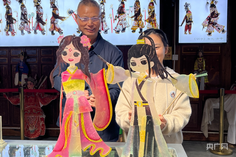 何泽华和他创新的皮影形象(宣州区融媒体供图)