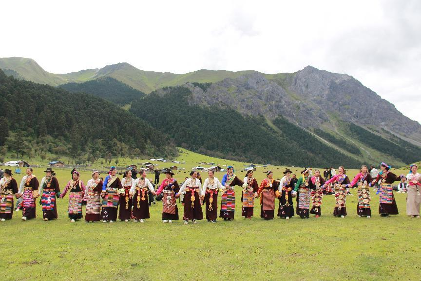 作品简介:赛马节期间,身着民族服饰的西藏女性群体在草地上一字排开,欢腾起舞。