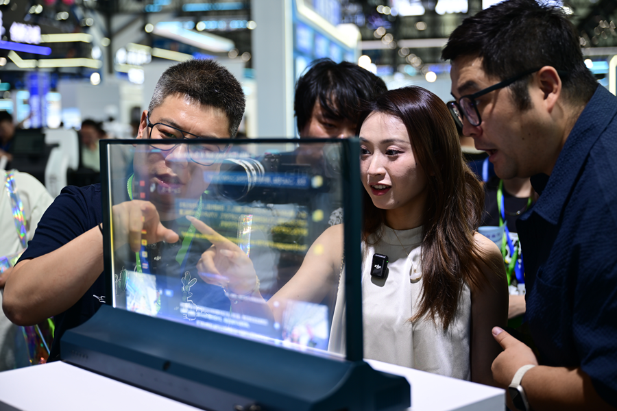 4月26日,观众在第三届中国(安徽)科技创新成果转化交易会上体验一款多语种AI透明屏。新华社记者 周牧 摄