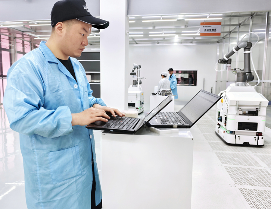 在优艾智合生产车间,形态各异的工业移动机器人,利用高精度同步定位与建图融合导航技术灵活穿梭、高效协同完成任务。在产品调试区,一台移动搬运机器人缓缓伸出手臂,将重达数十斤的晶圆盒精准放置在电子货架上,整个搬运过程实现了零损耗。“目前,我们的订单已经排到今年10月份,工程师们正争分夺秒保障生产。”优艾智合首席运营官孙梦介绍。