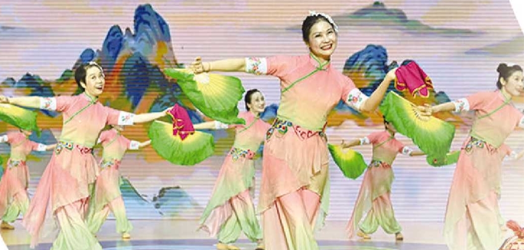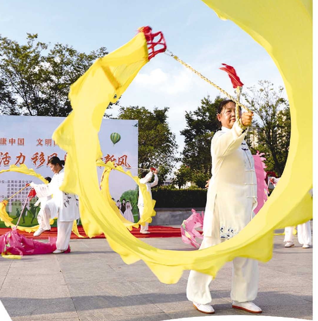 8月5日,亳州市蒙城县庄周街道鲲鹏湖社区举办全民健身展示活动。图为群众在舞动彩带龙。 胡卫国 摄