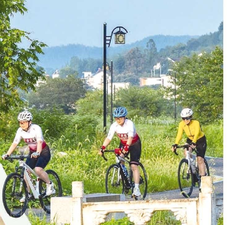 8月5日清晨,自行车运动爱好者在芜湖市峨溪河畔骑行晨练。肖本祥 摄